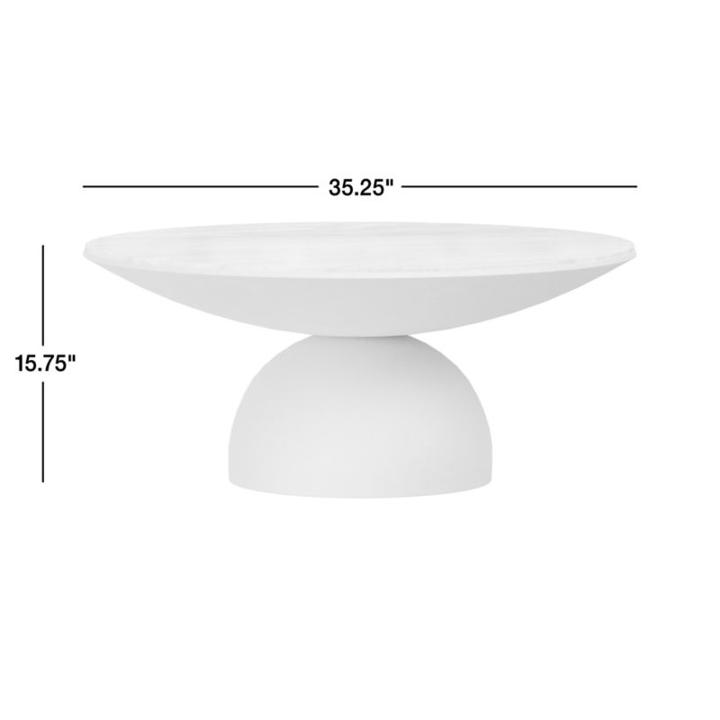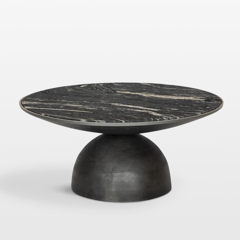 A true work of art, sculptural Dev perfectly balances two sliced spheres to create this gorgeous mixed-material coffee table. Hammered for light-catching texture, the grey-finished aluminum base curves in and out to support an inset tabletop of back marble. We love Dev's visual interplay of rustic metal and dynamically veined marble.