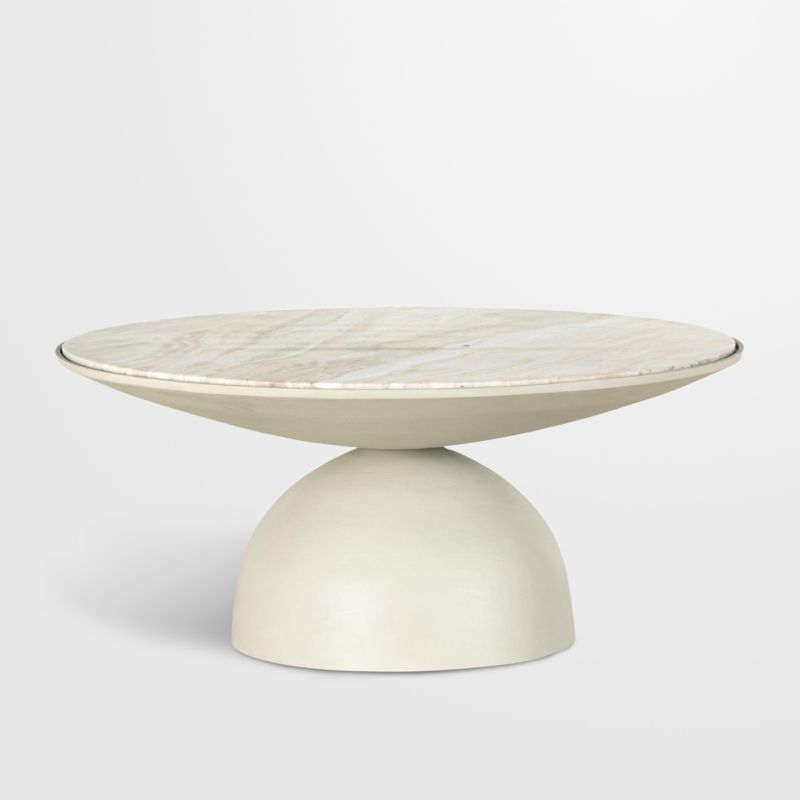 A true work of art, sculptural Dev perfectly balances two sliced spheres to create this gorgeous coffee table. Hammered for light-catching texture and finished with a matte off-white hue, the aluminum base curves in and out to support an inset table top of creamy white marble. We love Dev's striking silhouette and monochromatic coloring.
