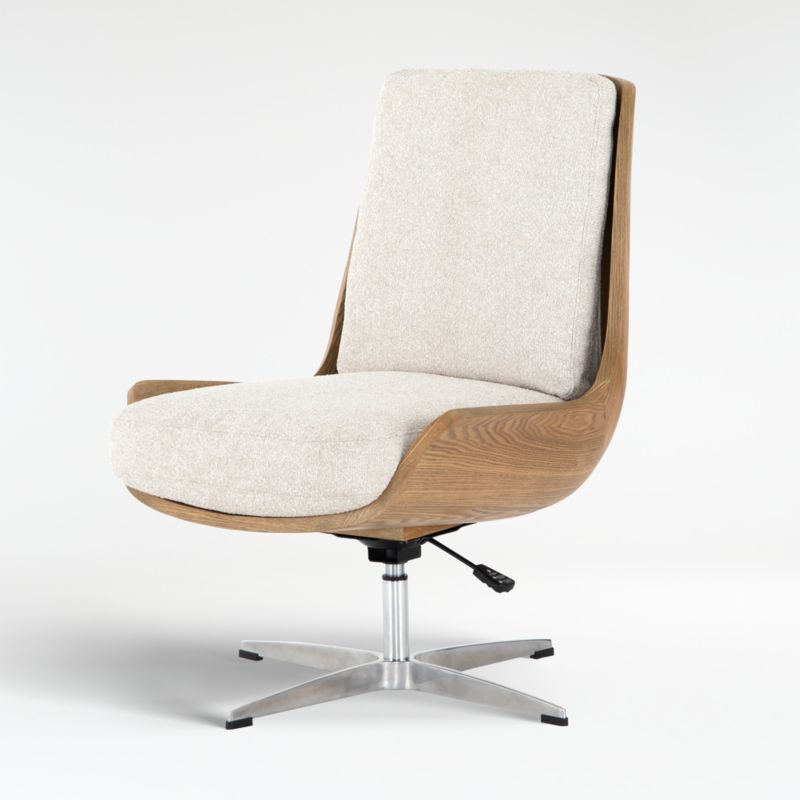 Introducing living room comfort for the home office. Our Diversey chair cradles sit-enhancing, sand-hued cushions in a sculpted, bentwood shell of toasted ash. Perched on a sleek aluminum base, the chair mixes materials with effortless style. Simple yet striking in design, the chair pairs beautifully with any of our clean-lined desks.
