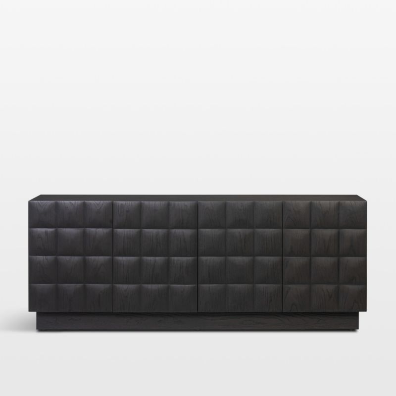 Donovan brings tactile dimension and refined simplicity to modern living room storage. Made of oak finished in silhouette-enhancing matte black, the media console showcases a gridded facade carved with rounded contours that accentuate the wood grain. Two double-door cabinets provide concealed storage with adjustable shelves and cord cutouts for storing media components as well as living room essentials. A recessed plinth base adds height and lightens the look.