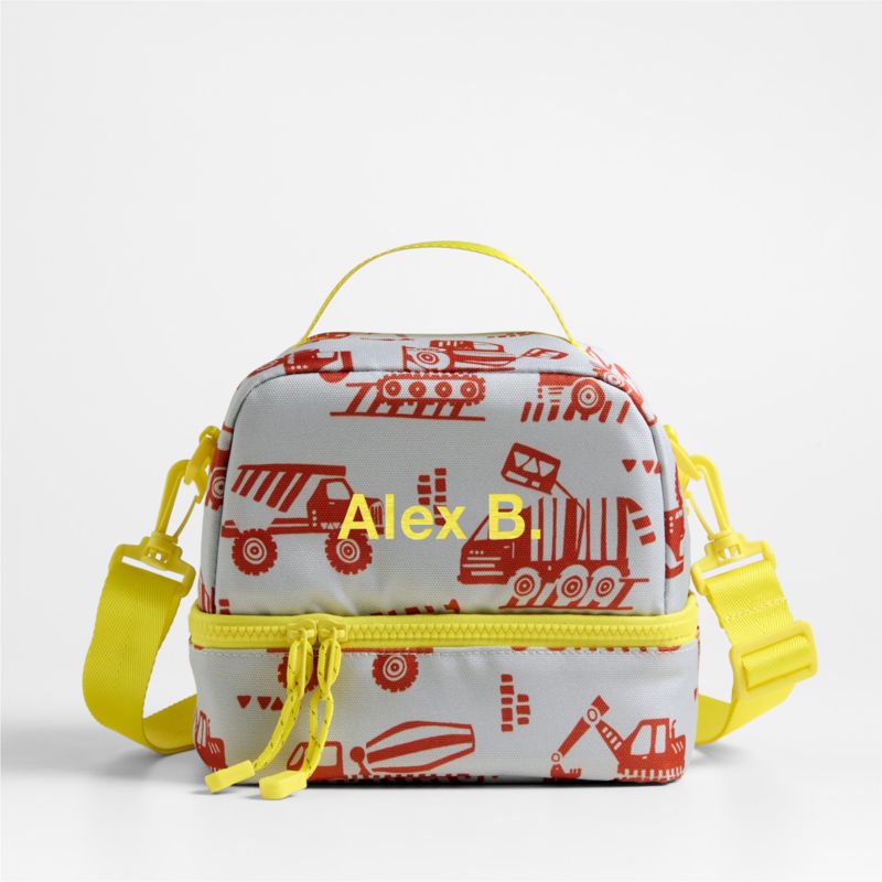 We spoke to hundreds of parents to get our lunch boxes just right. Our Dreamer Dual Compartment Lunch Box is perfectly sized to fit multiple food containers and a water bottle, with an interior divider to keep everything securely in place. In durable, insulated and easy-wipe polyester (that includes recycled plastic bottles), the construction truck print with bright yellow accents puts the vroom into lunchtime. For extra personality, have it monogrammed with their name or initials.