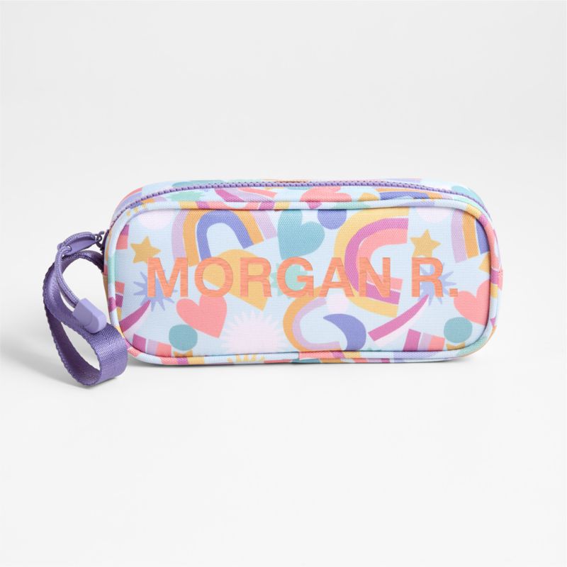A fun pencil case that's built to handle all the thrills of the day. A jumble of hearts and rainbows exudes happy vibes, with a purple zipper, zipper pull and loop handle for a perfect finish. Constructed of supremely durable polyester (that includes recycled plastic bottles), the roomy, easy-clean case makes it simple to keep pens and pencils organized and accessible. Pair with the matching lunch box and backpack for a totally coordinated look.