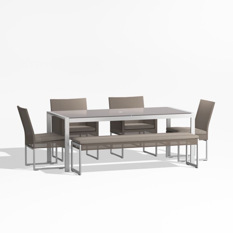 Our Dune set brings casual and contemporary dining outdoors. The sleek stainless steel aluminum table is precisely mitered at the corners, welded, ground and buffed by hand to a seamless appearance and topped with tempered glass, painted taupe on the underside for a modern, luminous look. Urban-style dining chairs and a bench wrap fade-, mold-, tear- and stain-resistant taupe mesh over sleek aluminum frames. For an extra layer of comfort, crisply tailored taupe cushions in a weather-resistant fabric look fresh all season long.