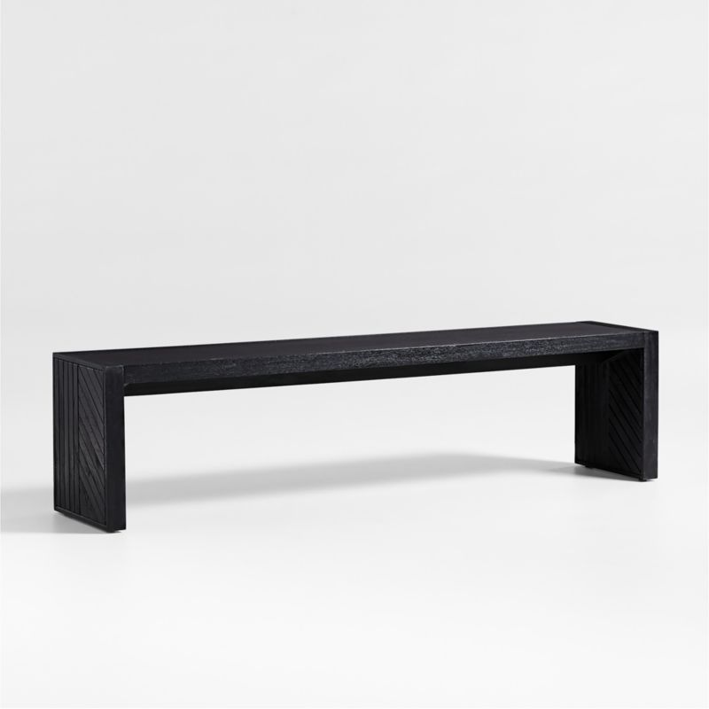 Employing the time-honored technique of parquetry, skilled woodworkers add artisan rusticity to our clean, contemporary Dunewood dining bench. Bringing geometric complexity to the waterfall legs, pieces of mango wood are carefully cut and inlaid by hand to create a modern mosaic of angled lines. Wirebrushing and an ebonized finish give the bench a bold and rustic look. Designed by Blake Tovin of Tovin Design, the dining bench seats two to three and pairs perfectly with the other pieces in our exclusive Dunewood collection.