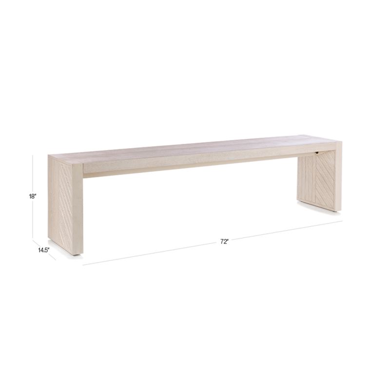 Employing the time-honored technique of parquetry, skilled woodworkers add artisan rusticity to our clean, contemporary Dunewood dining bench. Bringing geometric complexity to the waterfall legs, pieces of mango wood are carefully cut and inlaid by hand to create a modern mosaic of angled lines. A wash of white and a light distressing add a whisper of color and texture to enhance the sculptural presence of this bench, which brings a striking elegance to your dining room. Designed by Blake Tovin of Tovin Design, the whitewashed dining bench pairs perfectly with the other pieces in our exclusive Dunewood collection.