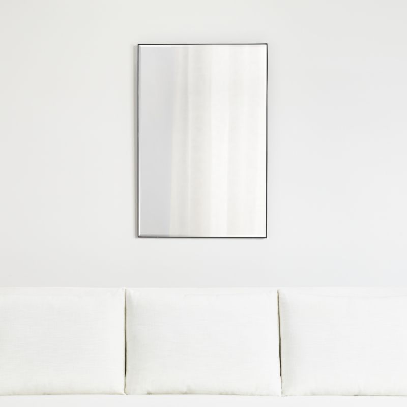 Edged with a slim gunmetal band, this rectangular wall mirror shapes a modern and minimalist silhouette. Beveled mirrored glass is bordered by a slender stainless steel frame with a dark finish. The rectangle mirror can be mounted on the wall horizontally or vertically and is ideal for hanging in an entryway, in the bathl or above a dresser in the bedroom.