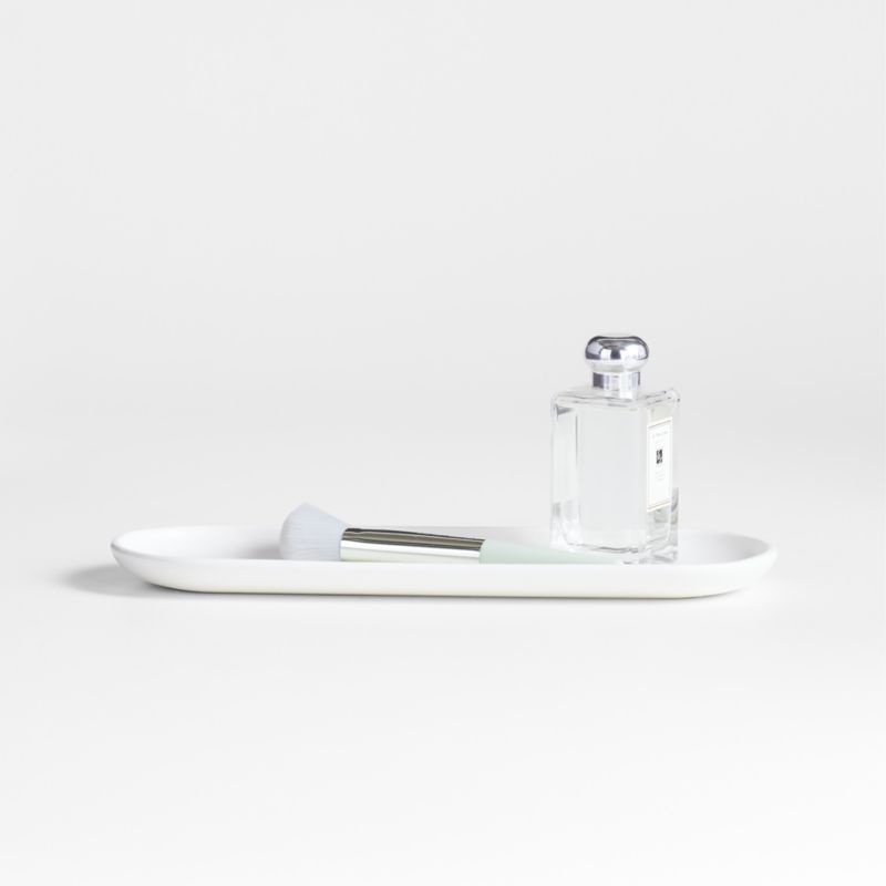 Durable porcelain shapes our classically coupe-shaped Eli vanity tray. The elongated dish corrals jewelry, cosmetics or a candle and room spray. A semi-matte white glaze coats the tray—sized to accommodate the Eli soap dish, soap pump and sphere canister—with a fresh, clean finish. Designed to blend in with any bathroom decor, this minimal and modern collection pairs especially harmoniously with our Eli vanities.