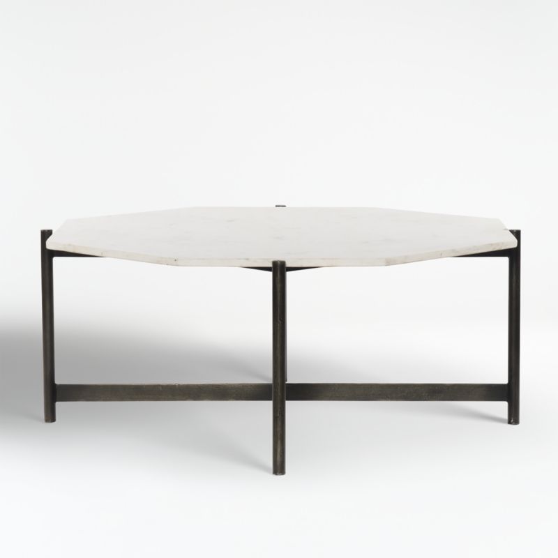 A study in contrasts, our Emilia coffee table rests a polygon of cool white marble on a crisscrossed base of dark grey-finished iron. The linear base complements the smooth white top with its rustic hammered texture. A modern classic, the Emilia table brings graphic interest to the living room.