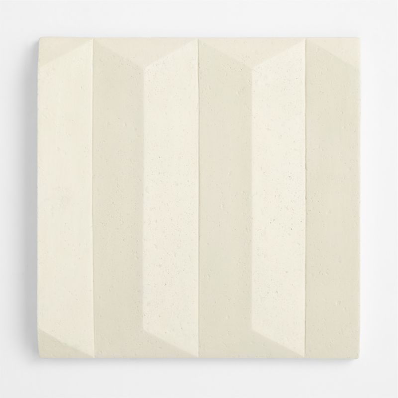 Molded from a mixture of volcanic ash, resin and fiberglass, this minimalist relief sculpture brings depth and movement to indoor and outdoor walls. The square tile lines up triangular prisms in a deceptively simple composition that produces an ever-changing show of light and shadow. Painted by hand in room-friendly ivory, the tile can be displayed singly or grouped in multiples to enliven your space with dynamic, dimensional pattern.