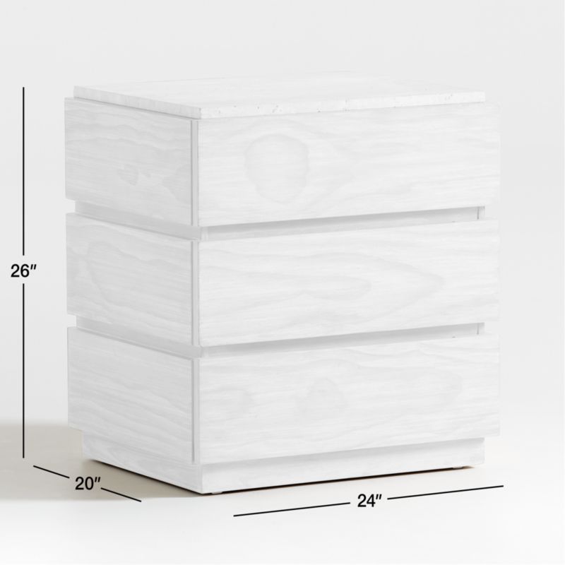 Refresh your bedroom decor with our breezy, coastal-inspired Ensenada nightstand. Flat-front drawers, grooved finger pulls and a plinth base put all the focus on the dynamic grain of pine veneer, enhanced by a light ceruse finish. A travertine top adds a bit of mix-material panache to the streamlined look. Ours exclusively, the nightstand pairs with the Ensenada dresser for a coordinated look.