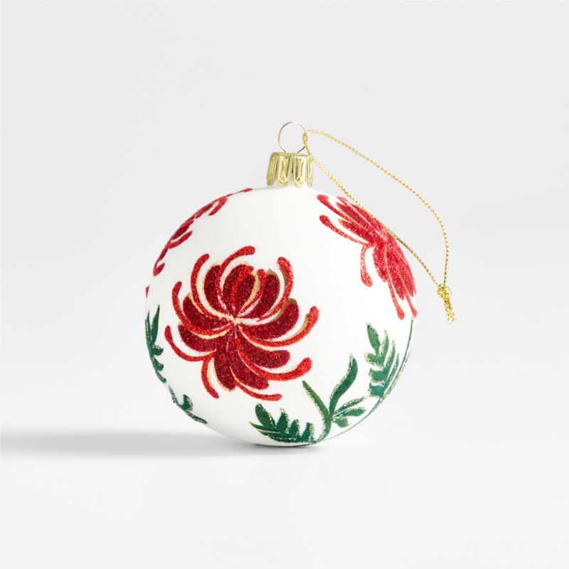 Our chrysanthemum Christmas ornament dresses your tree with exquisite artisanship. Hand-blown by talented craftspeople, the glass sphere is painted by hand with lavish ruby red blooms and emerald green foliage on snow-white. Glitter details sparkle in the glow of string lights. This gorgeous ornament is perfect for a formal tree with Old World glamour.