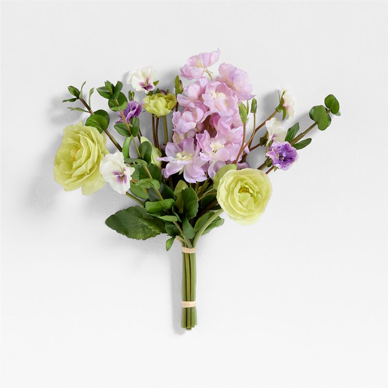 Skillfully crafted to look like a real floral bouquet, our faux stems keep the fresh vibe alive all year long. The bundle gathers together likelike pale green ranunculus blooms, white and purple pansies, pale pink cosmos and dark green eucalyptus. Tied with twine, the bouquet makes for easy gifting or pops in a vase for a summery refresh to your decor.