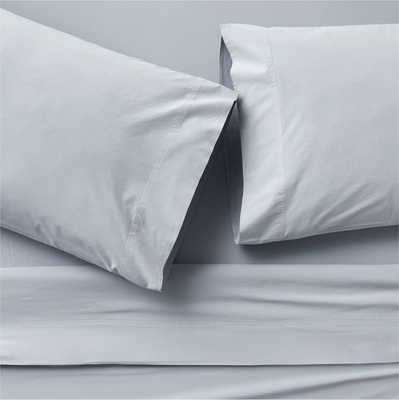 These washed organic cotton sheets caress with a supersoft finish in a serene misty blue that serves as an elevated neutral. Highly breathable and perfectly lightweight, the percale weave cools in the summer and comforts in the winter. Pair the sheets with the matching duvet cover and shams, or mix and match with our other exclusive organic cotton bedding to make a modern bed. Set includes one flat sheet, one fitted sheet and two standard pillowcases with full and queen sets or two king pillowcases with a king set.