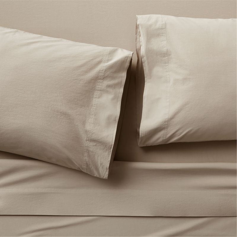 These washed organic cotton sheets caress with a supersoft finish in a sandy beige hue that is an understated neutral. Highly breathable and perfectly lightweight, the percale weave cools in the summer and comforts in the winter. Pair the sheets with the matching duvet cover and shams, or mix and match with our other exclusive organic cotton bedding to make a modern bed. Set includes one flat sheet, one fitted sheet and two standard pillowcases with full and queen sets or two king pillowcases with a king set.