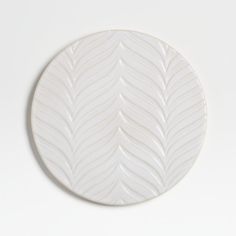 Inspired by fern fronds, rows of graceful curves emboss our ceramic Fern white ceramic trivet with texture, pattern and botanical beauty. The lightly speckled glaze coats the stoneware with a creamy finish that subtly reveals the clay below. Use the trivet to protect tables, buffets and counters from warm dishes and hot-from-the-oven pans. Complete the look with the coordinating pieces in our Fern collection. The white ceramic trivet is a Crate and Barrel exclusive.