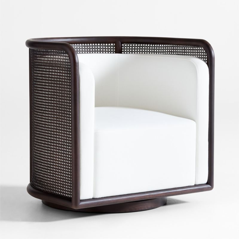 Classic bentwood and retro caning shape the breezy curves of our Fields swivel chair, a contemporary take on the traditional barrel chair. Sustainably sourced hardwood flows the seamless design, integrating back, armrest and leg into one fluid silhouette. Upholstered in white to contrast with the dark brown-finished wood, the tight back and cushion seat snuggle in for a comfy-yet-upright sit. A recessed swivel base lets the accent chair turn a full 360 degrees, making Fields a great choice to unite layouts or create a room within a room.