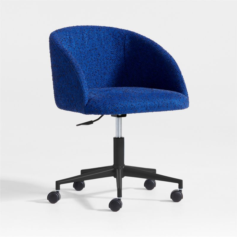 Brighten up study time with our modern kids desk chair that goes up, down and all around. Upholstered in a cobalt blue bouclé fabric flecked with black, the barrel-shaped chair sits soft and cozy, and swivels 360 degrees. Five caster wheels on a matte black star base travel smoothly over wood, carpet or an area rug. Comfortable yet supportive, the desk chair adjusts in height making it perfect for study sessions, craft time or game breaks.