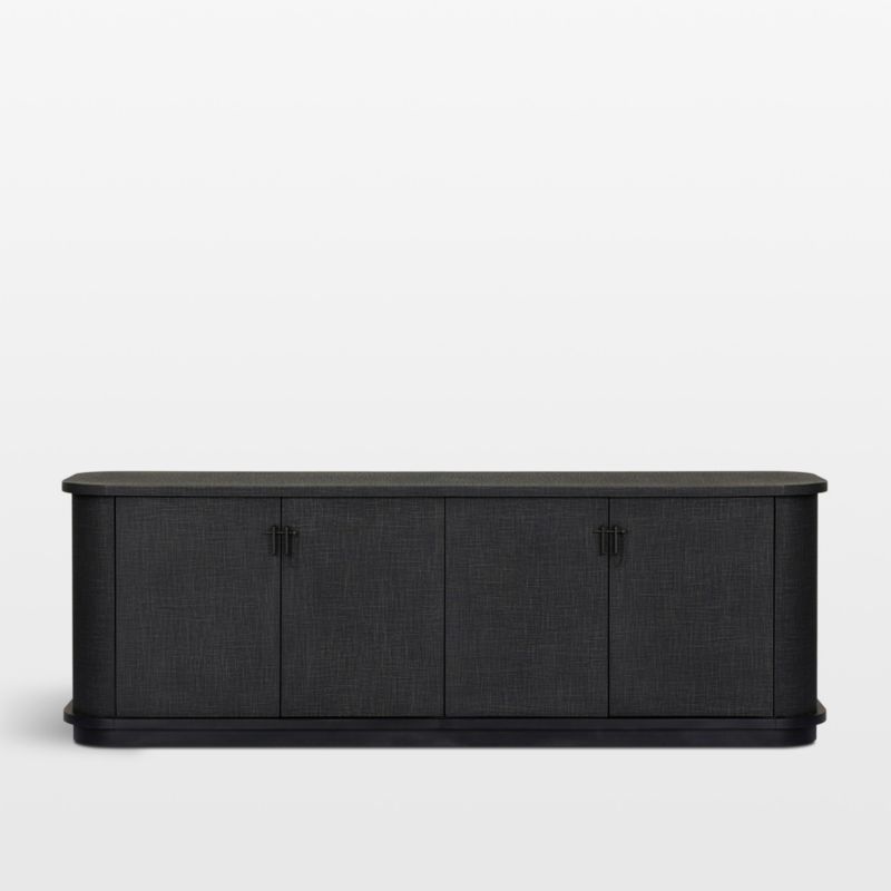 Curved corners and natural texture bring movement and distinct character to the Berlin console. Black linen wraps the seamless facade and rounded contours, capped by an ebony-stained mahogany top and stepped base. Pin-and-chain pulls finished in copper patina add intriguing detail while providing access to the generous storage found within the two double-doored cabinets.