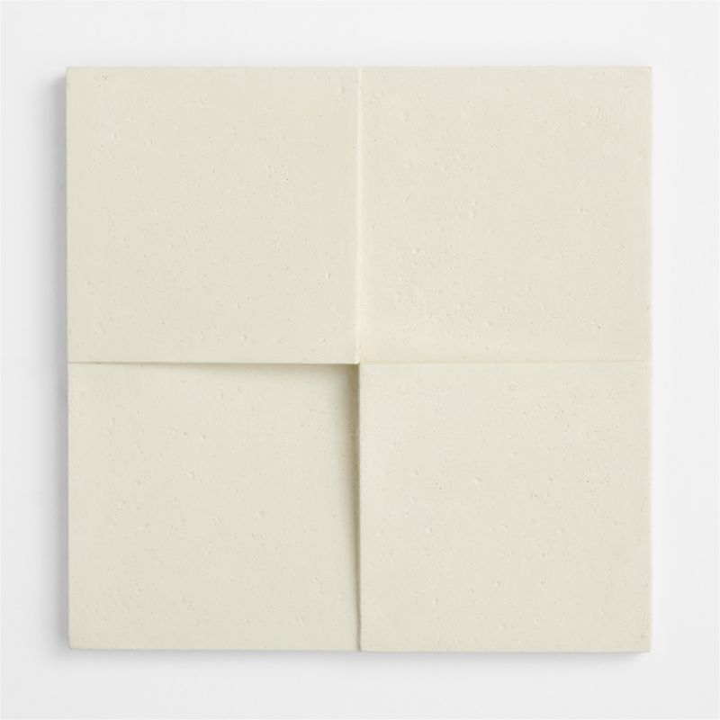 Molded from a mixture of volcanic ash, resin and fiberglass, this minimalist relief sculpture brings depth and movement to indoor and outdoor walls. The design aligns four squares at different depths in a deceptively simple composition that produces an ever-changing show of light and shadow. Painted by hand in room-friendly ivory, the square tile can be displayed singly or grouped in multiples to enliven your space with dynamic, dimensional pattern.