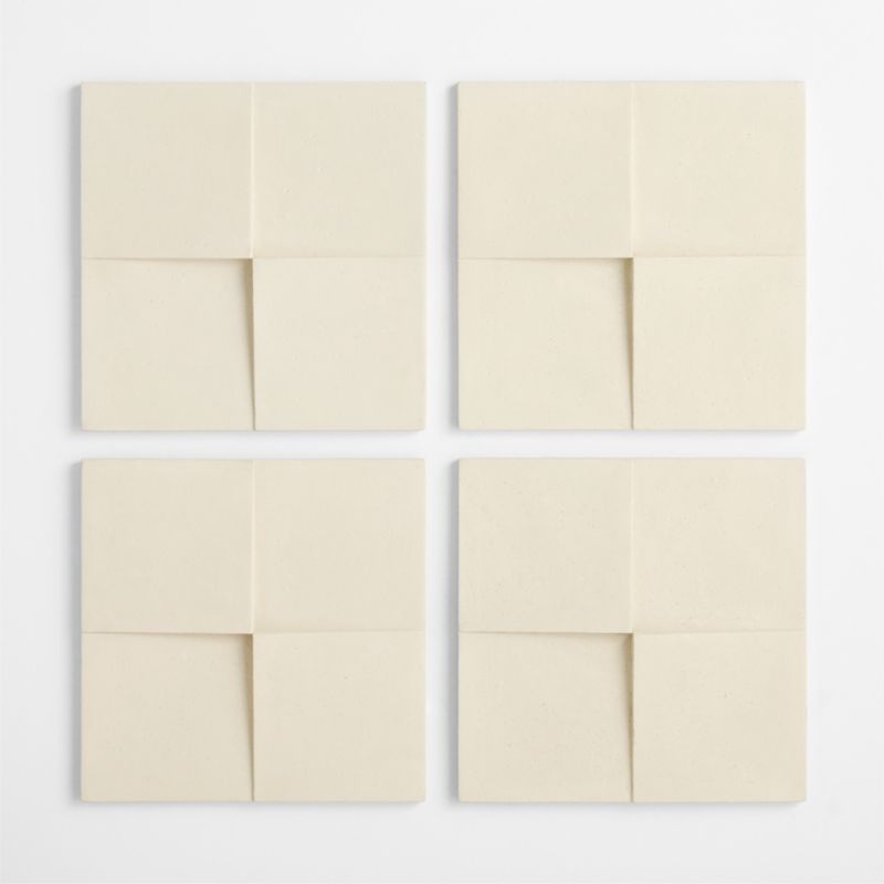 Molded from a mixture of volcanic ash, resin and fiberglass, these minimalist relief sculptures bring depth and movement to indoor and outdoor walls. The tile aligns four squares at different depths in a deceptively simple composition that produces an ever-changing show of light and shadow. Painted by hand in room-friendly ivory, the four square tiles in the set can be displayed in different orientations and groupings to enliven your space with dynamic, dimensional pattern.