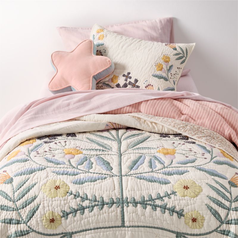 A charming folk-art inspired print and a fresh, modern palette make our Floral Fields quilt a forever piece. One side of the quilt features a large, mirrored pattern of butterflies fluttering among the petals in soft shades of lavender, green and yellow. Flip it over, and it's all about the delicate blooms, in a hand-drawn ditsy floral print. At once cozy and silky soft, the organic cotton voile is a dream for hot and cool sleepers alike. Pair it with our matching Floral Fields pillow sham for a sweetly coordinated look.