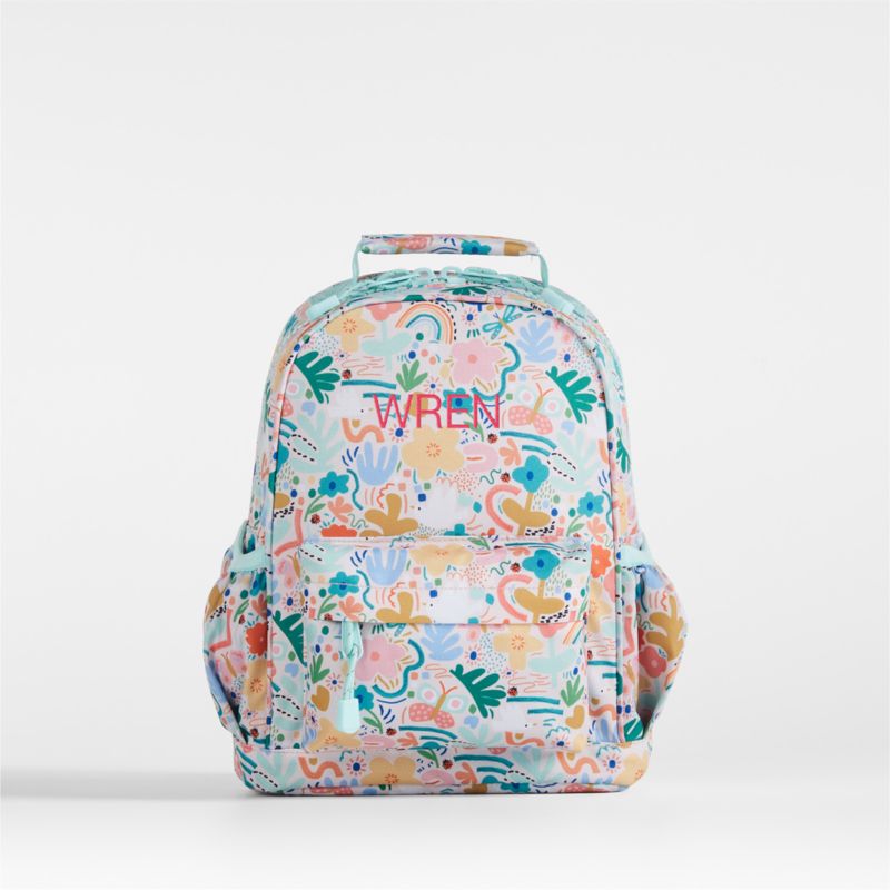 A floral backpack that's extra comfy and ready to handle daily adventures. Patterned with a colorful collection of garden friends that flit and flutter over the white exterior, the kids' small knapsack is constructed of supremely durable polyester made from recycled water bottles. A roomy interior holds everything your kid needs—books, school supplies, extra layers—and there's a padded pocket to keep their tablet protected. Outside pockets hold snacks, water bottles and more. Pair this book bag with the matching Flower Garden water bottle and lunch box to grow their collection.