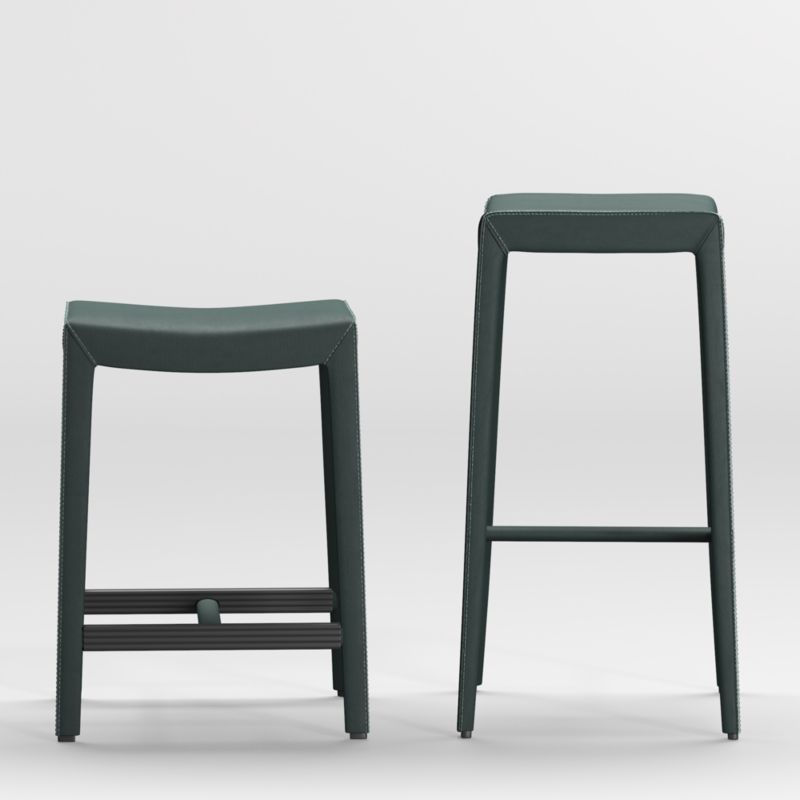 Folio Dark Green Top-Grain Leather Backless Bar Stools