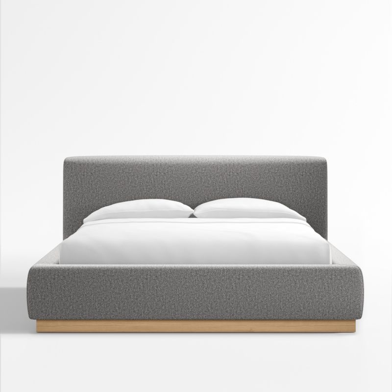 This upholstered bed brings the clean lines and casual comfort of our Gather sofa collection straight to the bedroom. Fully upholstered from the deep, full headboard to the wide rails, this plush bed is anchored by a plinth base of beautiful oak. Clad in a dove-grey bouclé fabric, the bed is detailed with mitred corners to match the wood's joinery, giving the entire bed a well-tailored look. The Gather bed is a Crate & Barrel exclusive.