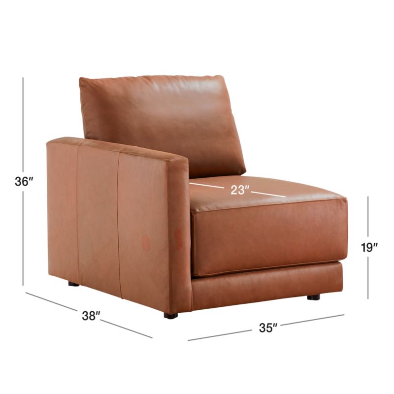 Gather Leather Left-Arm Chair Sectional Piece26"Hheight35"Wwidth38"DdepthMeasurements are in inches.66.04Hheight88.9Wwidth96.52DdepthcmMeasurements are in centimeters.