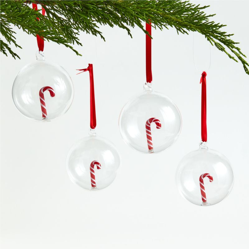 Candy canes have been used to decorate Christmas trees since 1670, and our set of four ornaments gives that sweet tradition a modern twist. Crafted entirely of durable borosilicate glass, a petite red and white candy cane stands within each snowglobe-like sphere. Hung from a bright red ribbon our exclusive tree ornaments delight with Christmas charm.