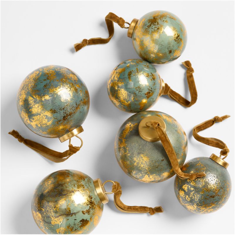 Dress your tree in gold and green. Our ornaments boast a verdigris finish that gives them the unique color, subtle texture and charm of impeccably aged flea market finds. Painted to mimic patinaed metal, the glass balls are adorned with gold-finished caps and luxe velvet ribbons. This set of six ball ornaments gives your Christmas tree a cohesive, collected-over-time look.