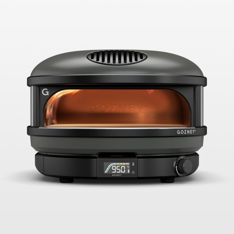 Enjoy restaurant-quality pizza at home with this compact pizza oven. The outdoor oven's thick stone floor, even heat distribution and superior heat retention deliver professional results. Gozney's ingenious rolling flame replicates a traditional wood-fired oven, reaching temperatures up to 950°F at the turn of a dial to cook a 14-inch pizza in less than a minute. Sleek in off-black with black and metal accents, the domed oven graces your backyard or patio with retro ski-lodge style.