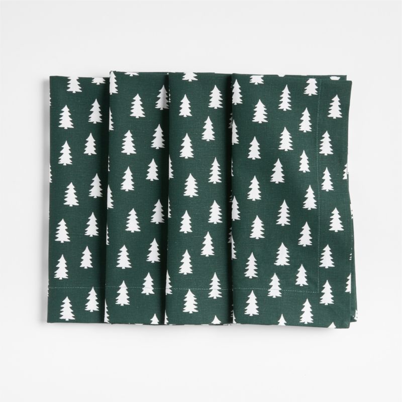 Seasonal and contemporary, our green dinner napkins are patterned with a forest of white pine-tree silhouettes. Tailored with generous hems, the napkins in this set of four pair beautifully with our white dinnerware and clean up easily in the washing machine and dryer after weeknight dinners or festive Christmas feasts.