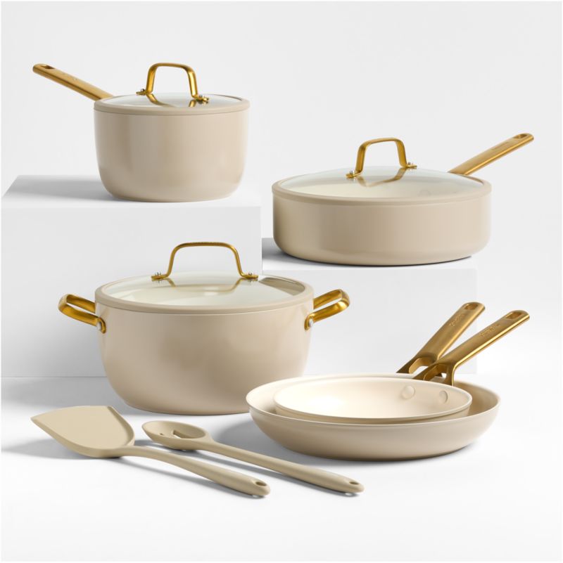 Coated in a creamy matte finish inspired by macadamias—and exclusive to Crate & Barrel—this 10-piece GreenPan Reserve Pro cookware set infuses world-class technology with bold, modern style. The hard-anodized aluminum pans are ultra-durable and superstrong, and their long-lasting Thermolon 9G surfaces offer easy clean up. And due to the advanced non-stick coating that distributes heat effectively, you can sear with just medium heat. Fitted with matching silicone rims, the domed glass lids fit snugly without chipping the pans. We especially love the gold handles that add serious glam to the sleek cookware. A fabulous wedding, graduation or housewarming gift, this set consists of 8- and 10-inch fry pans, 2-quart saucepan with lid, 3.2-quart saute pan with lid, 5-quart casserole pan with lid, and a macadamia-hued silicone turner and slotted spoon—plus three bonus pan protectors and a Wonder sponge.