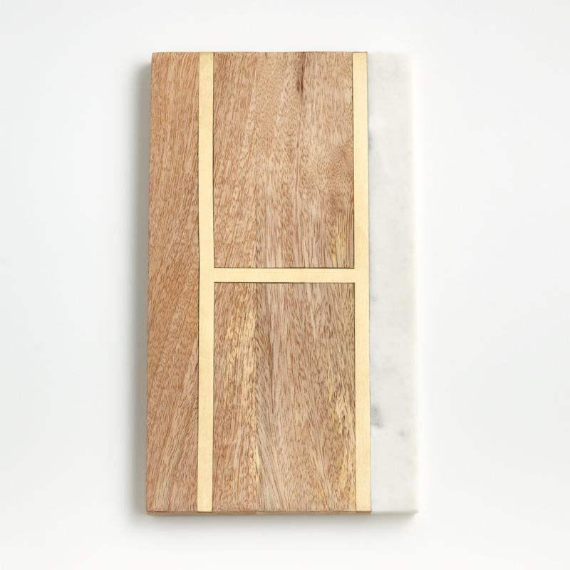 Serve crudités and charcuterie with a personal touch on this stunning monogrammed serving board. Composed of gorgeous renewable mango wood—from trees no longer producing fruit—and white marble, the board boldly spells out the oversized letter "H" with gleaming inlaid brass in a crisp, modern font. Highly skilled craftspeople carve, inlay and finish each board by hand, creating an individualized housewarming, graduation or wedding gift. Due to the natural materials and handcrafted techniques, each monogrammed serving board is unique.