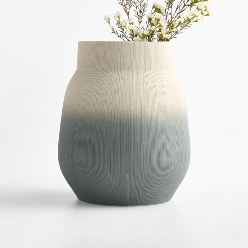 Our Harbour vases capture the point where sea meets sand. Light grey glaze flows into dusty blue or blue-green in an oceanic ombre effect that enhances the calm curves or dynamic angles. Skilled artisans craft each vase by hand, sculpting durable porcelain, texturing it with slender scratched ribbing and coating it with the dreamy matte glazes. Abstract and sculptural, the Harbour vases set a serene mood on their own or filled with fresh botanicals.