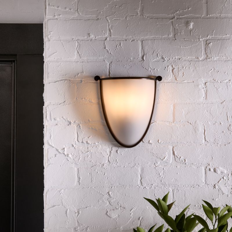 Inspired by Art Deco details and silhouettes, this graceful sconce adorns and illuminates your home, indoors or out. Petite scrolls flow into the wall light's slim frame, outlining the etched-glass shade that casts beautifully diffused light. The bronze finish was carefully chosen by designer Jake Arnold to subtly blend into a home's exterior or stand out warmly against interior walls. Holloway has a warm, welcoming presence flanking a front door on a porch or in an entryway.