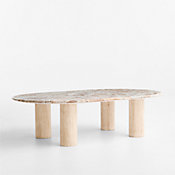 This set of two Homage side tables pays tribute to the beauty of natural materials with bold proportions and simple shapes. Styled with smooth bull-nose edges, the round top showcases the uniquely varied earth tones and dramatic veining characteristic of Toronto marble. An oversized cylindrical pedestal base complements with the lively grain of white oak, enhanced with an ivory ceruse finish.