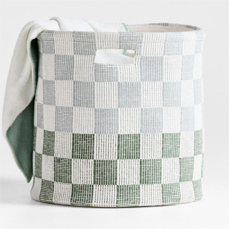 Get on board with cheerful checks—our Hopscotch Checkerboard Storage Bin makes a playful style statement in any room. The woven organic cotton container is durable and roomy enough for toys, linens or craft supplies, while the graphic, versatile pattern in mist blue and pine green brightens up nurseries, bedrooms, playrooms and shared family spaces.