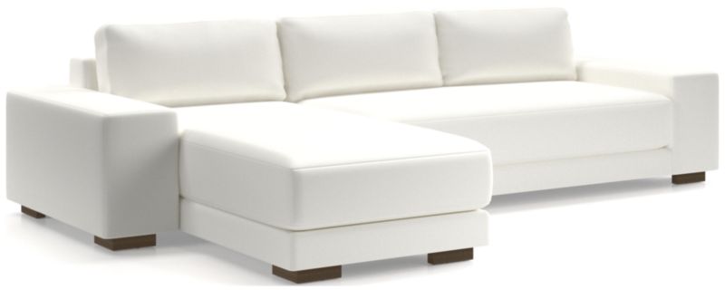Inspired by modern European furniture design, our Horizon sectional sofa sits low and relaxed while looking quintessentially contemporary. Comprising a right-arm sofa and left-arm chaise, the two-piece sectional has thick bench seats that sit deep with medium-soft cushioning and foot-wide, well-padded armrests that can serve as a momentary perch for conversing or a temporary landing spot for a plate of hors d'oeuvres. Pillow back cushions take a relaxed angle while providing comfortable support. Horizon is available in stock and custom fabric options.