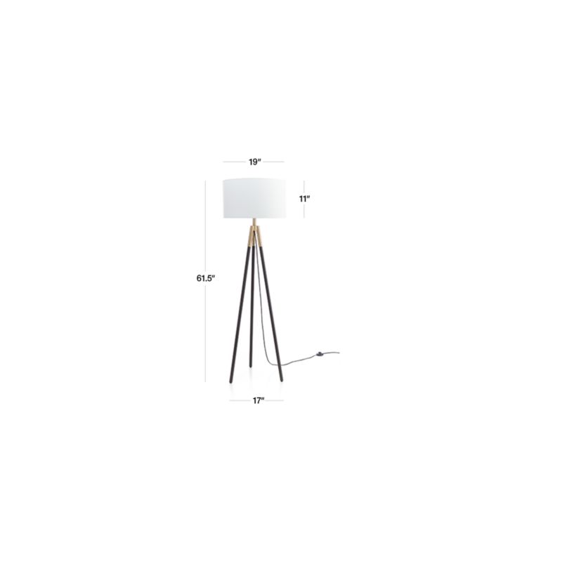 Our Hyde floor lamp's tripod base combines the industrial appeal of a professional photographer's light with sculptural lines. Geometric and contemporary, the lamp brings its simple geometry and on-trend mix of brushed brass and dark bronze to a living room or library. We love the way its open triangle of slender lines opens up a dark corner and adds vertical counterpoint to a sofa. Topped with a clean white linen drum shade, the lamp casts a soft ambient glow or a more focused pool of light for reading.