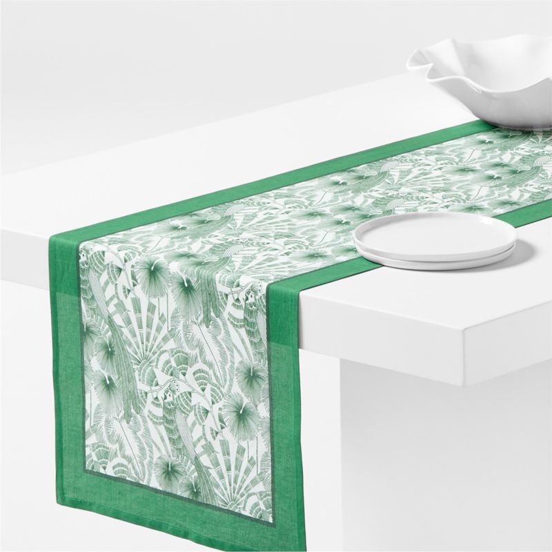 Intricate linework creates this table runner's lush and intricate pattern of fancifully feathered birds ensconced in dense rainforest greenery. Digitally printed on a linen-cotton blend, the green imagery pops on a white ground. Bordered in solid green, the runner adds a tropical note to the summer table.