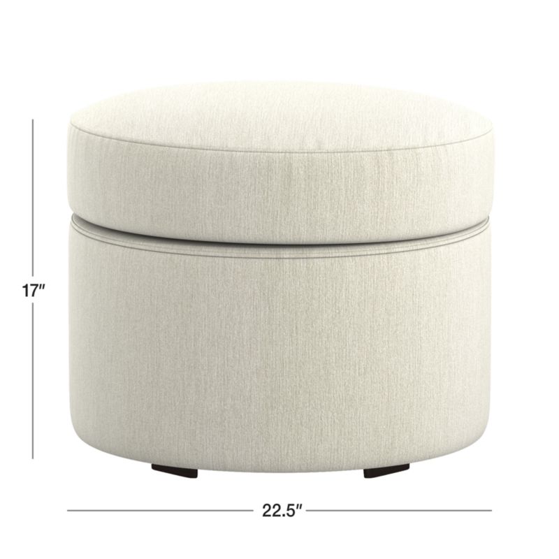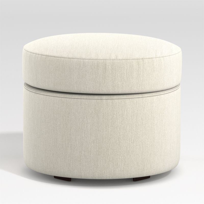 Channeling 1930s Hollywood, Infiniti takes center stage in the modern living room with glamorous curves and velvety upholstery. The round ottoman complements the Infiniti sofa's flowing lines, tailored in a super-durable, yarn-dyed polyester fabric that captures the luxurious look and feel of soft, heathered chenille. As a room-tidying plus, the seat lifts up to reveal storage space for pillows, throws and more. The Infiniti storage ottoman is a Crate & Barrel exclusive.