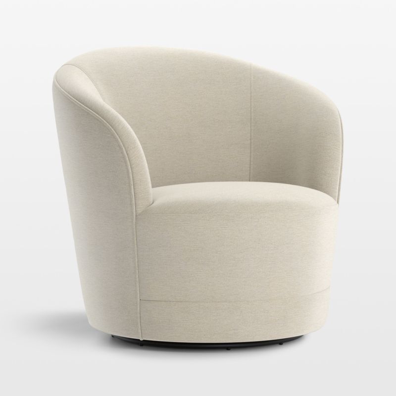 Channeling 1930s Hollywood, Infiniti shows off its glamorous curves in a super-durable fabric that captures the luxurious look and feel of soft, heathered chenille. Enjoy the cozy embrace of Infiniti's semi-circular tight back and snug cushion. Plus, the chair's swivel feature lets you follow the action without leaving your seat. The Infiniti Swivel Chair is a Crate and Barrel exclusive.