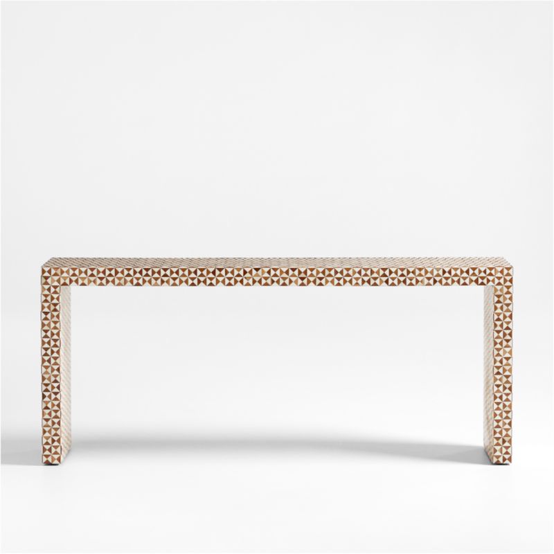 True to the tradition of intarsia—the time-honored technique of fitting together bits of wood in a mosaic-like design—skilled artisans inlay triangles of handcut teak and bone to create this artisanal console table. The simple Parsons-style design lets the workmanship and materials take center stage.