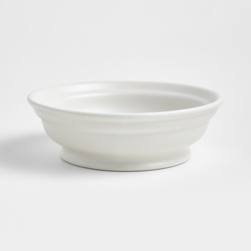 Flip, stack, serve and feast. Inspired by handmade pieces from his California studio, artist James Lewis designed this versatile dinnerware collection just for us. A pedestal base elevates this stoneware low bowl for a classical look. Glazed creamy white, the dish is ideal for pastas, stews or entree salads. This ingenious bowl can also serve as a lid for the Jamesware cereal bowl, dinner plate, side dish or bowl, and any of those pieces can top this bowl as a lid. Inner ridges and broad rims ensure pieces fit together snugly. Combine the low bowl with other gorgeous dishes from our modular, small-batch ceramics collection to expand the stacking and serving possibilities.