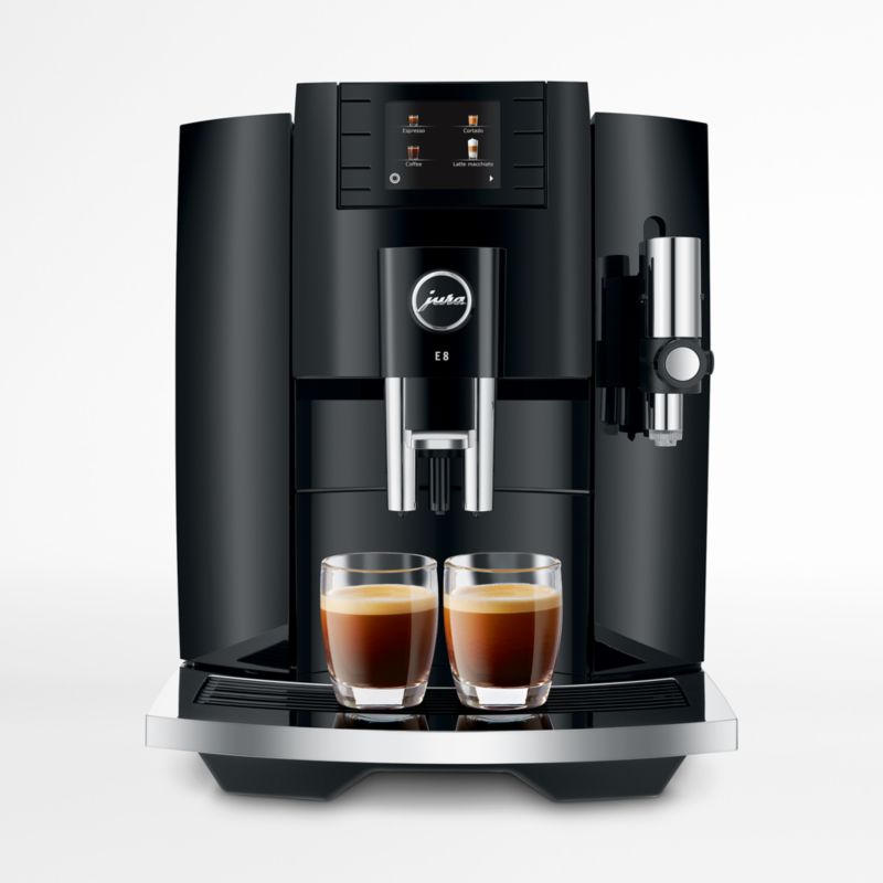 The best-selling JURA E8 espresso machine features a color display and an artificial intelligence-driven operating system that adapts to your preferences. Taking inspiration from professional espresso machines, the coffee maker's Professional Aroma burr grinder optimizes aroma while the signature Pulse Extraction Process optimizes extraction for superior flavor. Fully programmable for water amount, coffee strength and brewing temperature, the machine creates 17 coffee options in double or single servings, including espresso, Americano, flat white, latte macchiato, cappuccino and more. A professional fine foam frother adds a creamy layer to your coffee of choice. Automatic milk system cleaning, rinsing and descaling programs add to the convenience of this compact black espresso machine designed for the home barista.