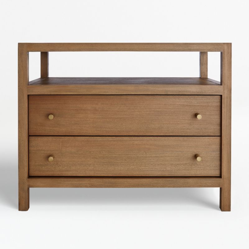 Refined and bold, Keane takes bedroom furniture beyond simple storage. Scaled to create a stately presence in the master bedroom, each piece is crafted of beautiful mahogany and meranti with a grey-wash driftwood finish. The wood nightstand features inset panels to draw the eye to its clean, architectural lines. Mirroring the linear look of the Keane bed, the generously sized two-drawer nightstand floats a top shelf and accommodates modern living with a powerstrip inside the top drawer. Our best-selling Keane collection is a Crate & Barrel exclusive.