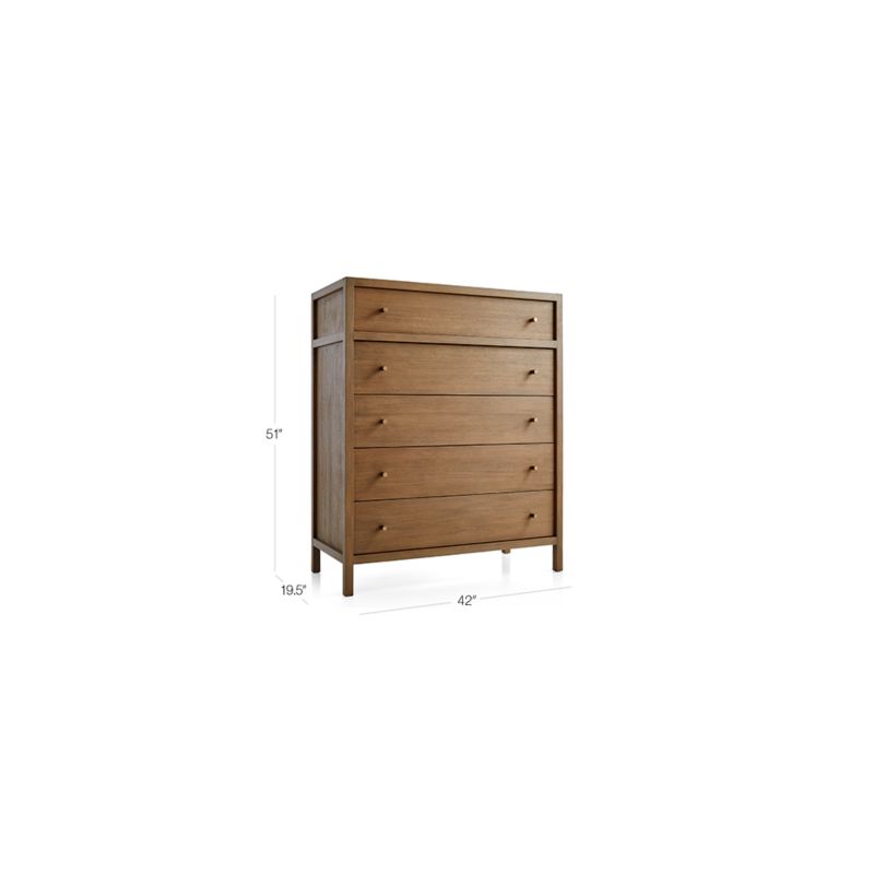 Refined and bold, Keane takes bedroom storage to the next level. Scaled to create a stately presence in the bedroom, each piece is crafted of beautiful mahogany and meranti woods with a natural finish. The chest stacks five drawers with inset panels and channel detailing to draw the eye to its clean, architectural lines. Round pulls dot the surface with a warm brass finish. Our best-selling Keane collection is a Crate & Barrel exclusive.