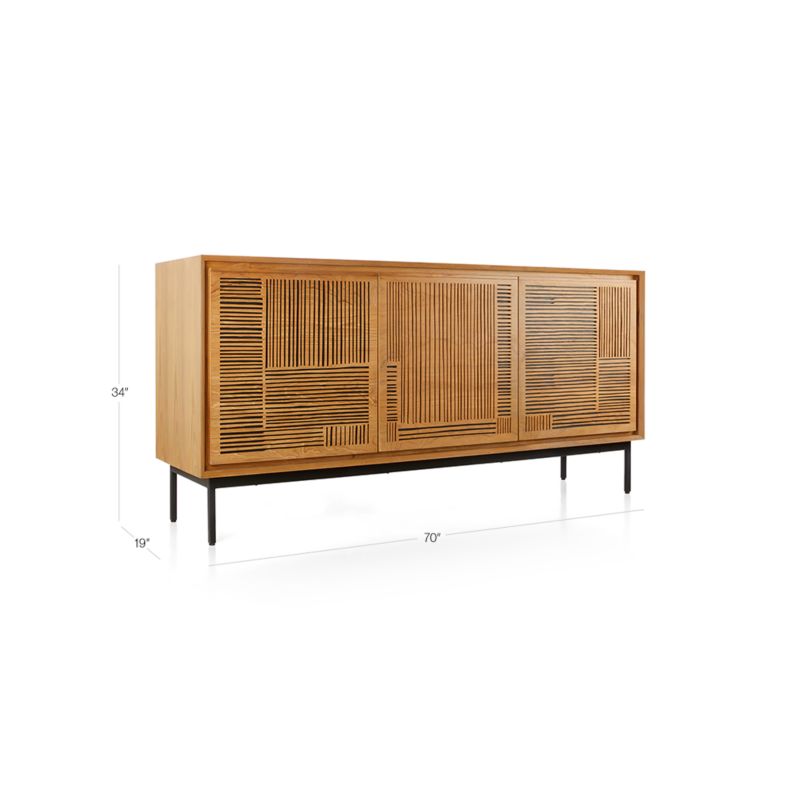 The bold textural treatment of our clean-lined Keenan credenza feels handcrafted and unique. Inspired by traditional Japanese block prints, the teak façade's dynamic pattern of perpendicular lines was cut from a hand-drawn design and backed in a dark-stained panel for added dimension. Crafted of FSC ®-certified solid teak, teak veneer and mahogany veneer, the three-door credenza gets a lift from a slender black metal base. We love the perfectly imperfect charm Keenan exudes as a buffet, bar or media center. The Keenan Credenza is a Crate and Barrel exclusive.